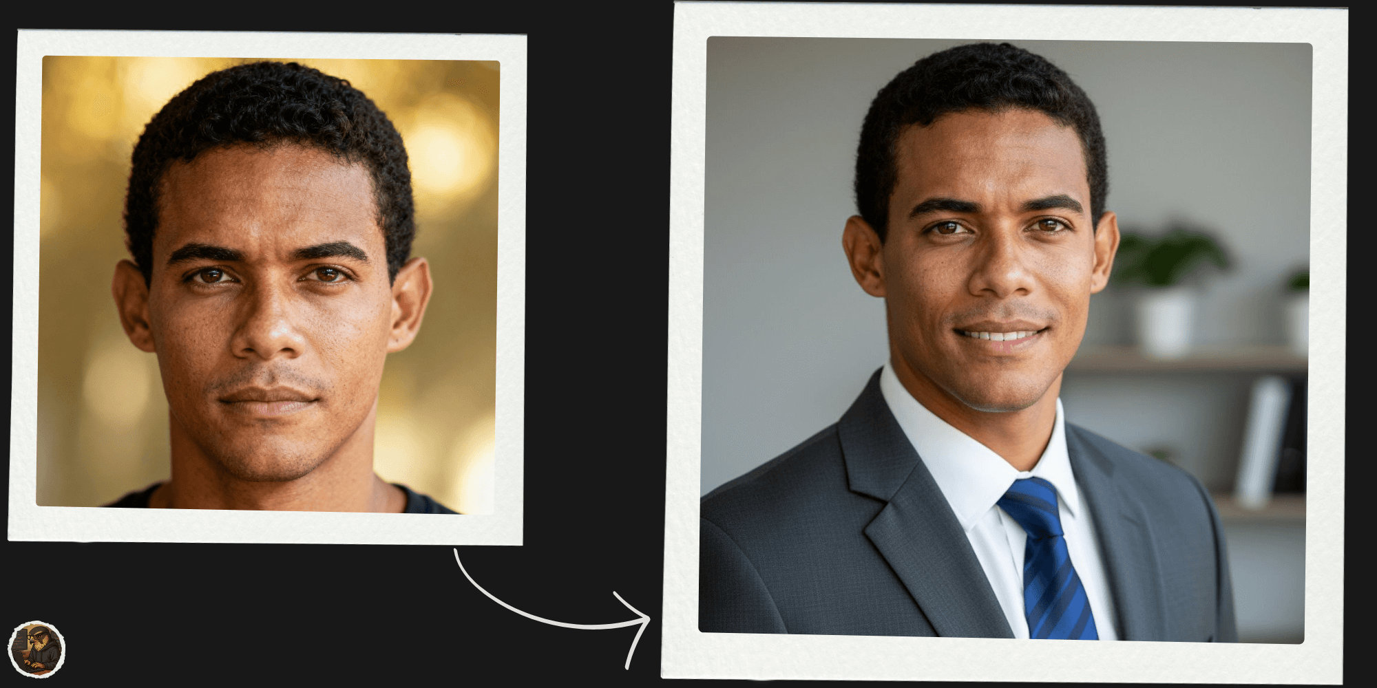 Antes e depois: selfie transformada em headshot profissional corporativo com IA - iluminação de estúdio premium